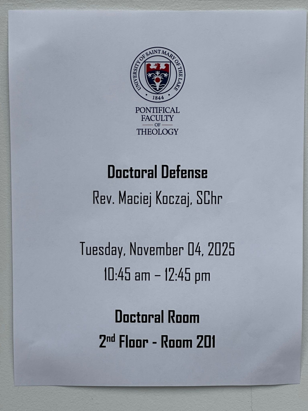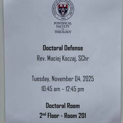4 listopada 2025 r. na Uniwersytecie Saint Mary of the Lake w Mundelein, IL (USA), nasz Współbrat, ks. Maciej Koczaj SChr pomyślnie obronił rozprawę doktorską z teologii systematycznej zatytułowaną Theologies of the Divine Mercy Image in the Post-Communist Context (Teologie obrazu Bożego Miłosierdzia w postkomunistycznym kontekście). Promotorem pracy był prof. dr Matthew Levering – jeden z najwybitniejszych współczesnych teologów anglojęzycznych, autor licznych publikacji z zakresu teologii dogmatycznej i duchowości. Recenzentami byli ks. prof. Emery de Gaál oraz ks. dr Marek Duran, dziekan wydziału teologii USML.
