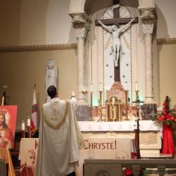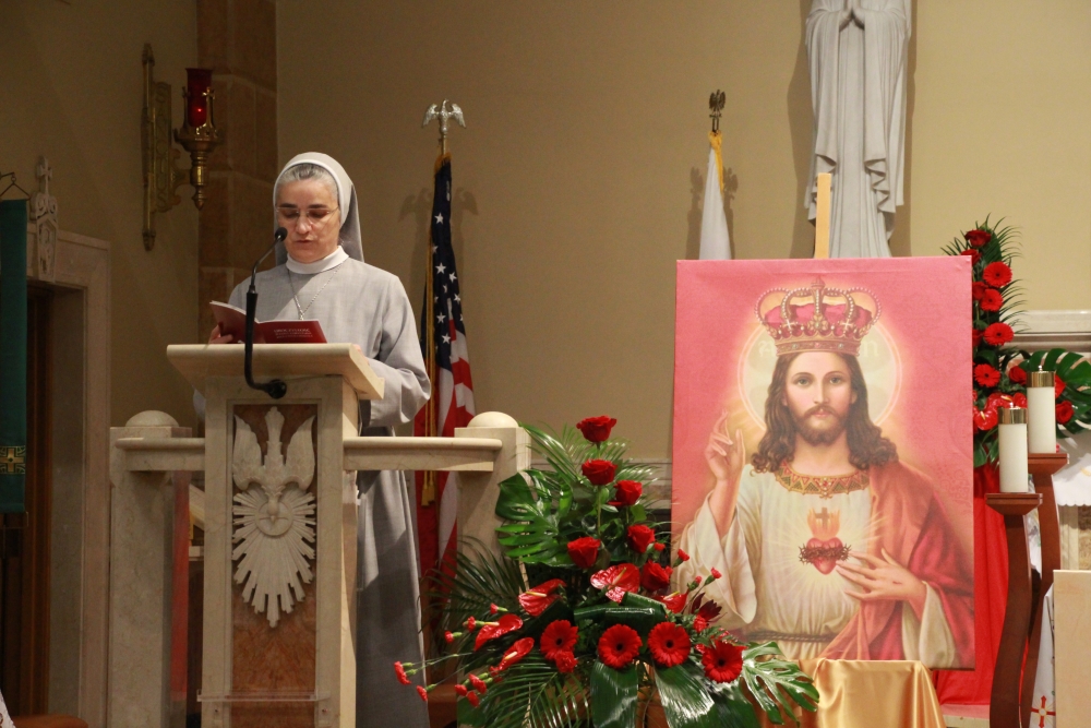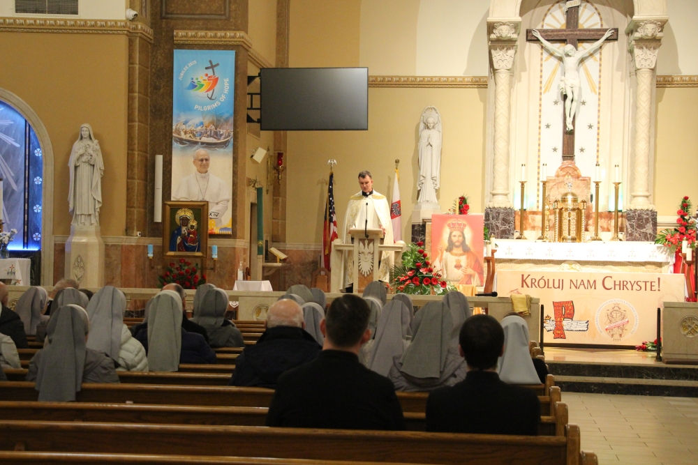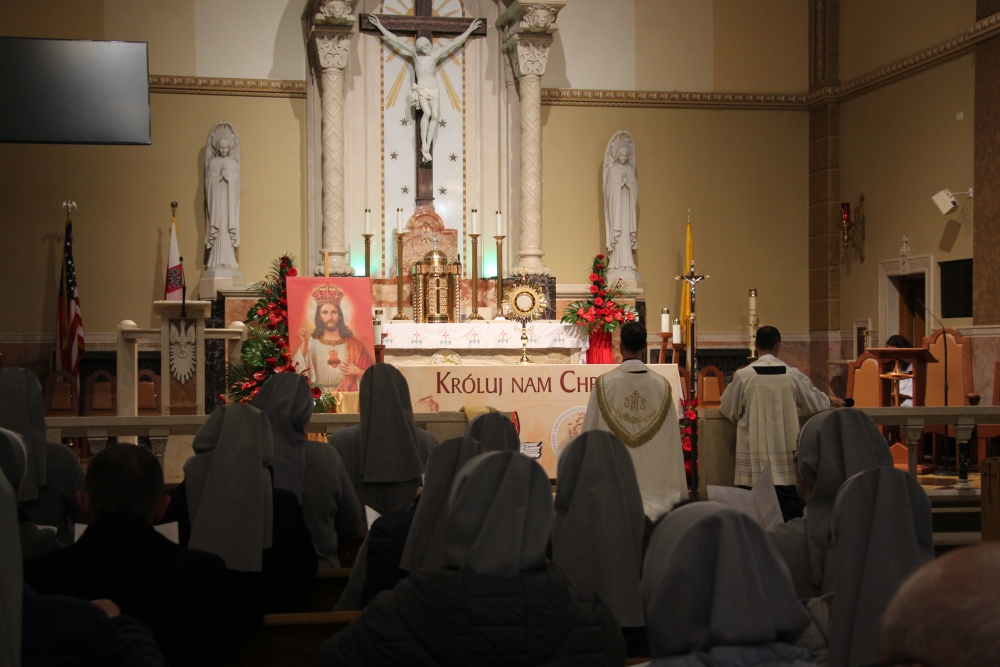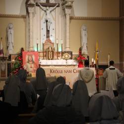 Księża i siostry uczestniczyli w pierwszych nieszporach. Liturgia ubogacona została oprawą muzyczną wzorowaną na liturgii sprawowanej w domu głównym chrystusowców w Poznaniu. Nieszporom przewodniczył i okolicznościową homilię wygłosił ekonom prowincji północnoamerykańskiej chrystusowców, ks. Adam Słomiński SChr. Kaznodzieja podkreślił, że „zanim poznamy Chrystusa Króla i Boga potrzebujemy uznać swoją słabość, którą Jezus ukochał do tego stopnia, że chciał posmakować człowieczeństwa. Jako Chrystusowcy i Misjonarki jesteśmy wezwani by poznać godność swego powołania.” Podczas liturgii księża i siostry odnowili swoje śluby zakonne. Celebracja liturgiczna zakończyła się odśpiewaniem inwokacji do Chrystusa Króla. Świętowanie zostało zwieńczone agapą zorganizowaną w sali parafialnej. Króluj nam Chryste!